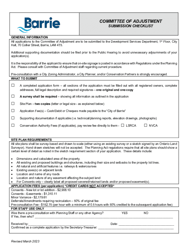 COMMITTEE OF ADJUSTMENT SUBMISSION CHECKLISTGENERAL INFORMATION All applications to the Committee of Adjustment are to be submitted to the Development Services Department, 1st Floor, City Hall, 70