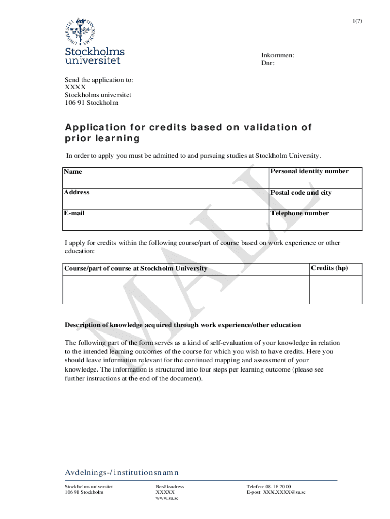 Get the free Application for credits based on validation of prior learning