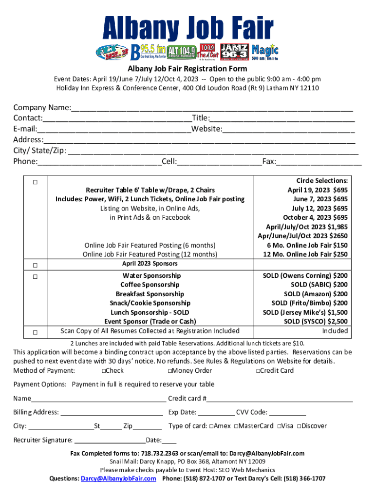 Albany Job Fair Registration Forewent Dates: April 19/June 7/July 12/Oct 4, 2023 Open to the public 9:00 am 4:00 pm Holiday Inn Express & Conference Center, 400 Old London Road (Rt 9) Latham NY 12110Company