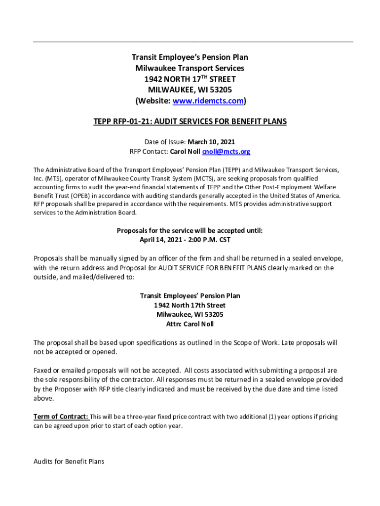 Transit Employees Pension Plan Milwaukee Transport Services 1942 NORTH 17TH STREET MILWAUKEE, WI 53205 (Website: www.ridemcts.com) EPP RFP0121: AUDIT SERVICES FOR BENEFIT PLANS Date of Issue: March