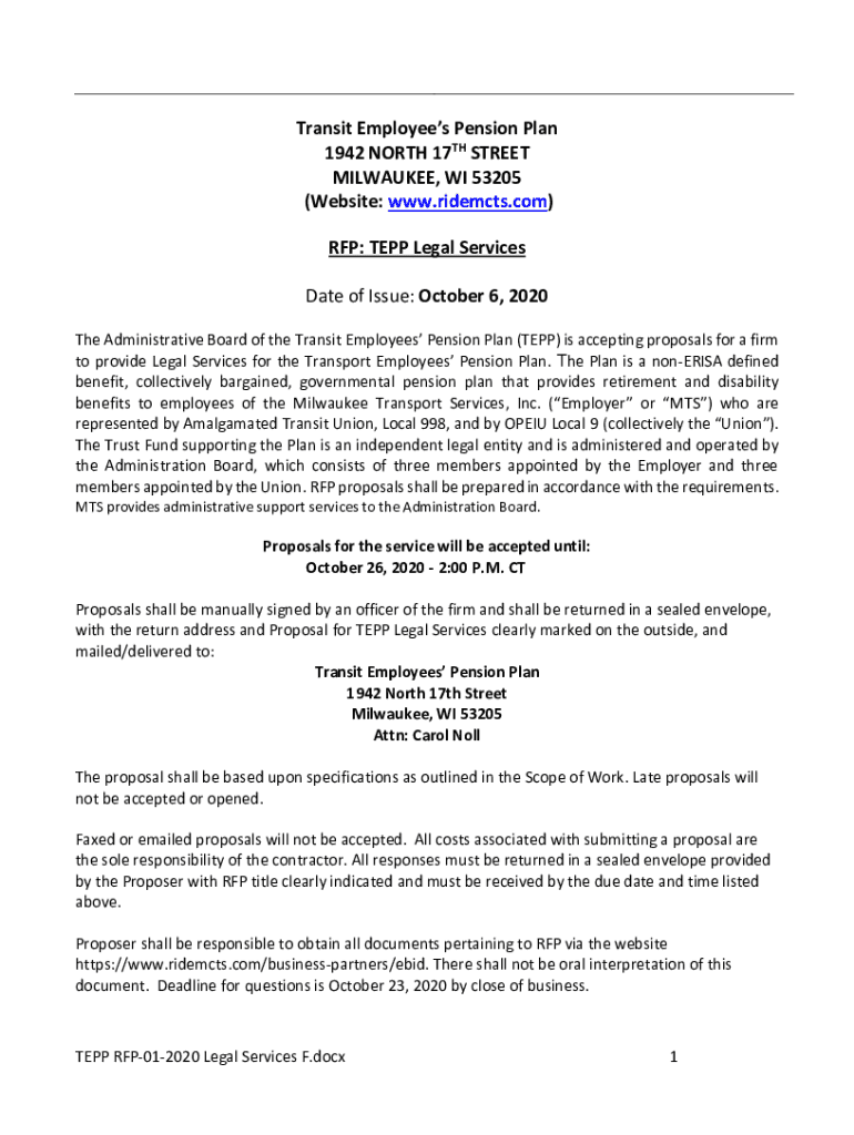 Transit Employees Pension Plan 1942 NORTH 17TH STREET MILWAUKEE, WI 53205 (Website: www.ridemcts.com) RFP: EPP Legal Services Date of Issue: October 6, 2020, The Administrative Board of the Transit