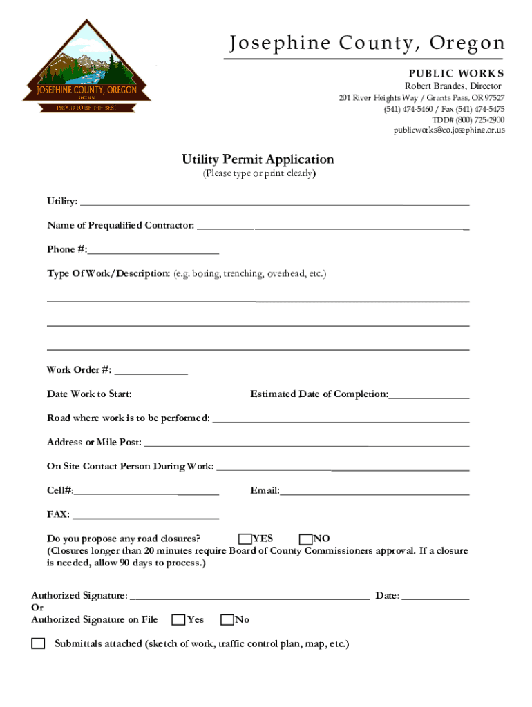 Josephine County, Oregon PU B L IC W O OK S Robert Branded, Director 201 River Heights Way / Grants Pass, OR 97527 (541) 4745460 / Fax (541) 4745475 TDD# (800) 7252900 publicworks@co.josephine.or.usUtility