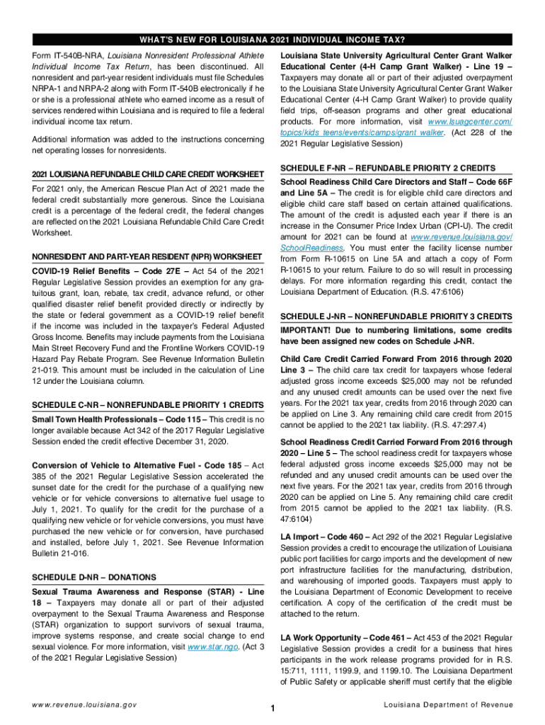 WHAT'S NEW FOR LOUISIANA 2021 INDIVIDUAL INCOME TAX? Louisiana State University Agricultural Center Grant Walker Educational Center (4H Camp Grant Walker) Line 19 Taxpayers may donate all or part