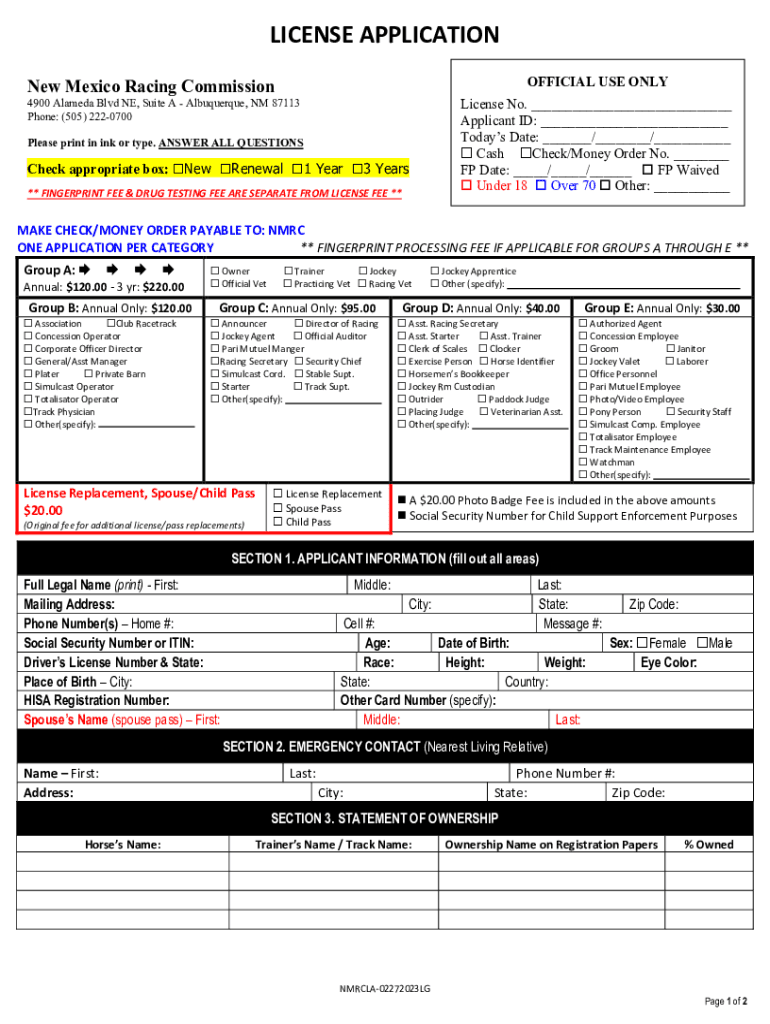 LICENSE APPLICATION OFFICIAL USE Online Mexico Racing CommissionLicense No. ___ Applicant ID: ___ Today's Date: ___/___/___ Cash Check/Money Order No. ___ FP Date: ___/___/___ FP Waived Under 18 Over
