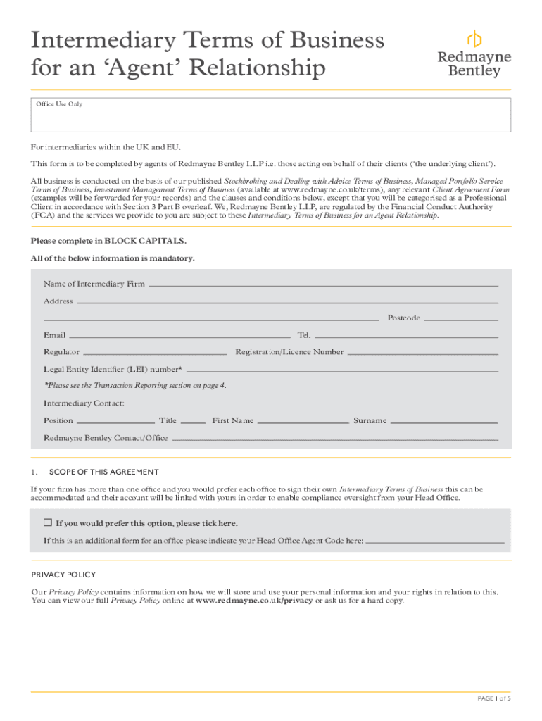 Intermediary Terms of Business for an Agent Relationship Office Use Only intermediaries within the UK and EU. This form is to be completed by agents of Redman Bentley LLP i.e. those acting on behalf