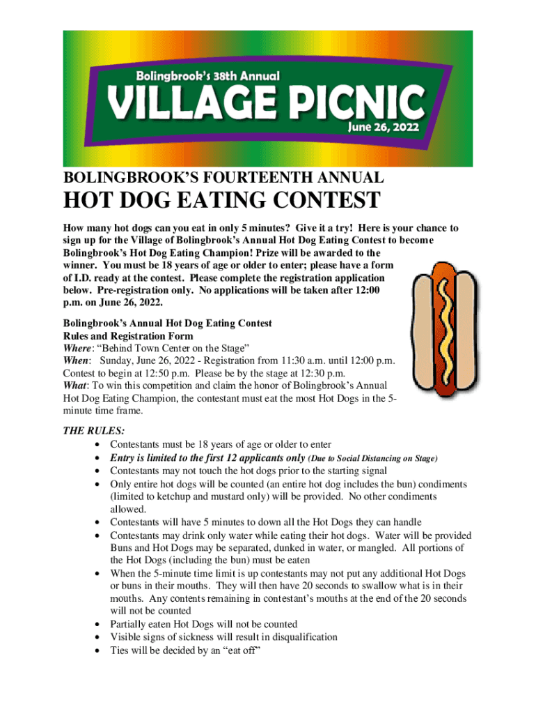 BOLINGBROOK FOURTEENTH ANNUAL DOG EATING CONTEST How many hot dogs can you eat in only 5 minutes? Give it a try! Here is your chance to sign up for the Village of Bolingbrook Annual Hot Dog Eating