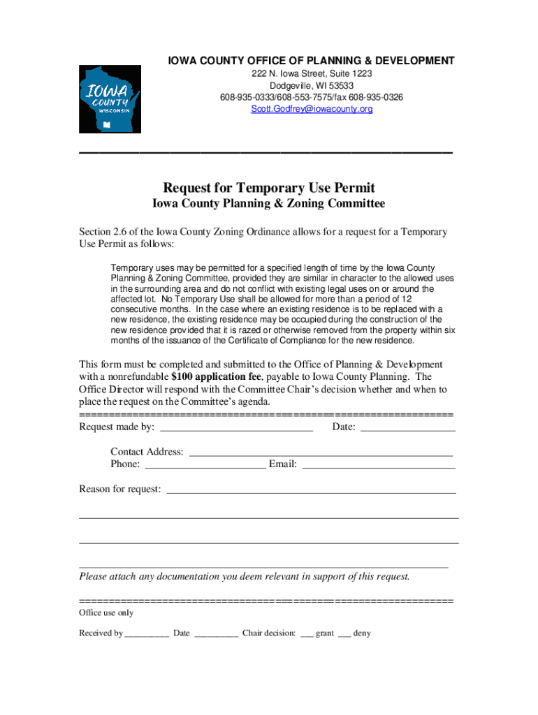 IOWA COUNTY OFFICE OF PLANNING & DEVELOPMENT 222 N. Iowa Street, Suite 1223 Hodgenville, WI 53533 6089350333/6085537575/fax 6089350326 Scott.Godfrey@iowacounty.org___ Request for Temporary Use Permit