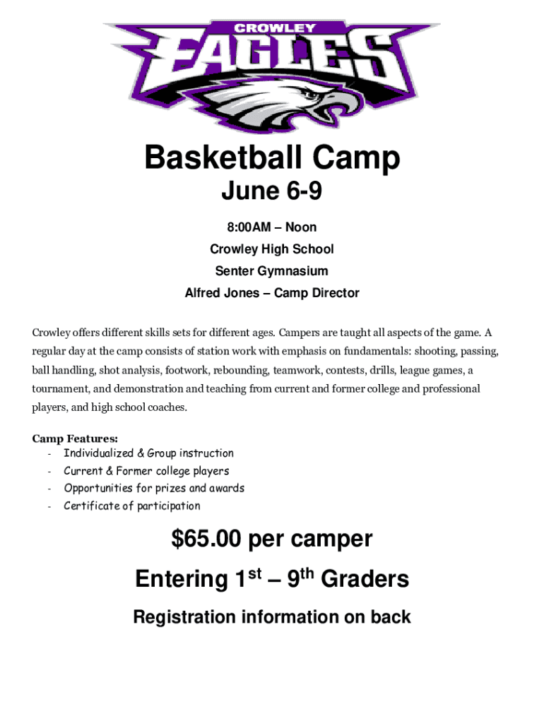 Basketball Camp June 69 8:00AM Noon Crowley High School Center Gymnasium Alfred Jones Camp Director Crowley offers different skills sets for different ages. Campers are taught all aspects of the game.