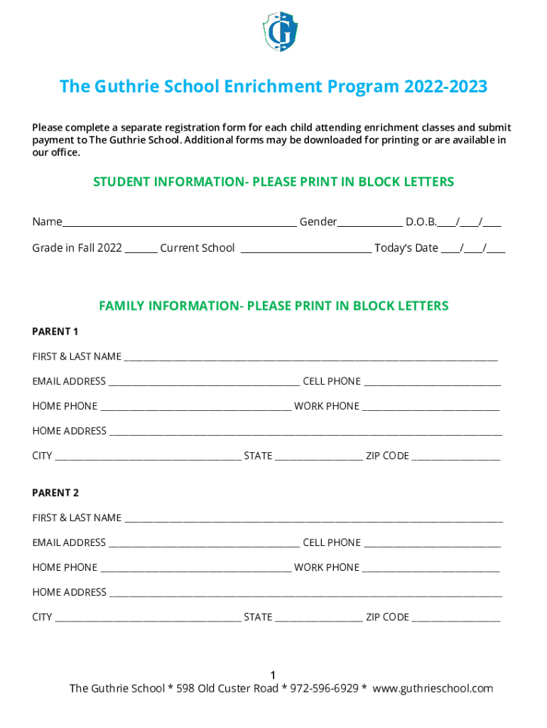 The Guthrie School Enrichment Program 20222023 Please complete a separate registration form for each child attending enrichment classes and submit payment to The Guthrie School. Additional forms may