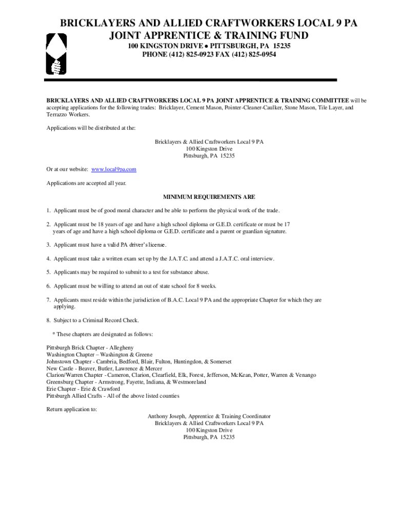 BRICKLAYERS AND ALLIED CRAFTWORKERS LOCAL 9 PA JOINT APPRENTICE & TRAINING FUND 100 KINGSTON DRIVE PITTSBURGH, PA 15235 PHONE (412) 8250923 FAX (412) 8250954BRICKLAYERS AND ALLIED CRAFTWORKERS LOCAL