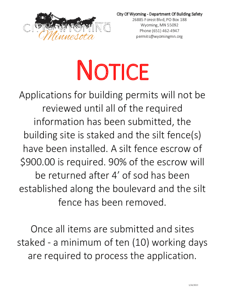 City Of Wyoming Department Of Building Safety 26885 Forest Blvd, PO Box 188 Wyoming, MN 55092 Phone (651) 4624947 permits@wyomingmn.orgNOTICEApplications for building permits will not be reviewed