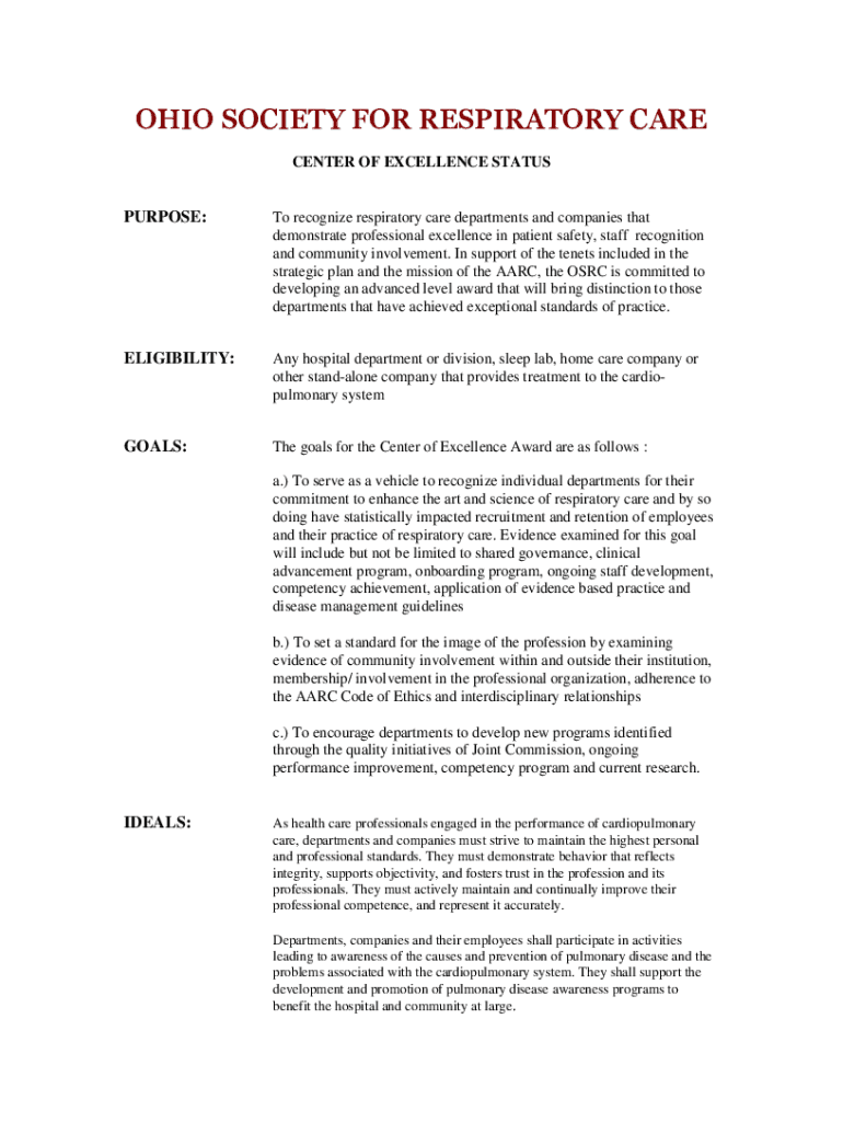 OHIO SOCIETY FOR RESPIRATORY CARE CENTER OF EXCELLENCE STATUSPURPOSE:To recognize respiratory care departments and companies that demonstrate professional excellence in patient safety, staff recognition