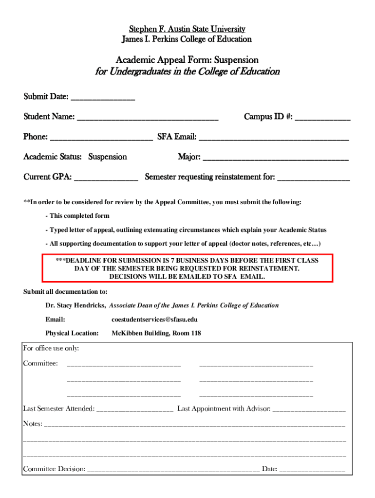 Stephen F. Austin State University James I. Perkins College of EducationAcademic Appeal Form: Suspension for Undergraduates in the College of Education Submit Date: ___ Student Name: ___Campus ID