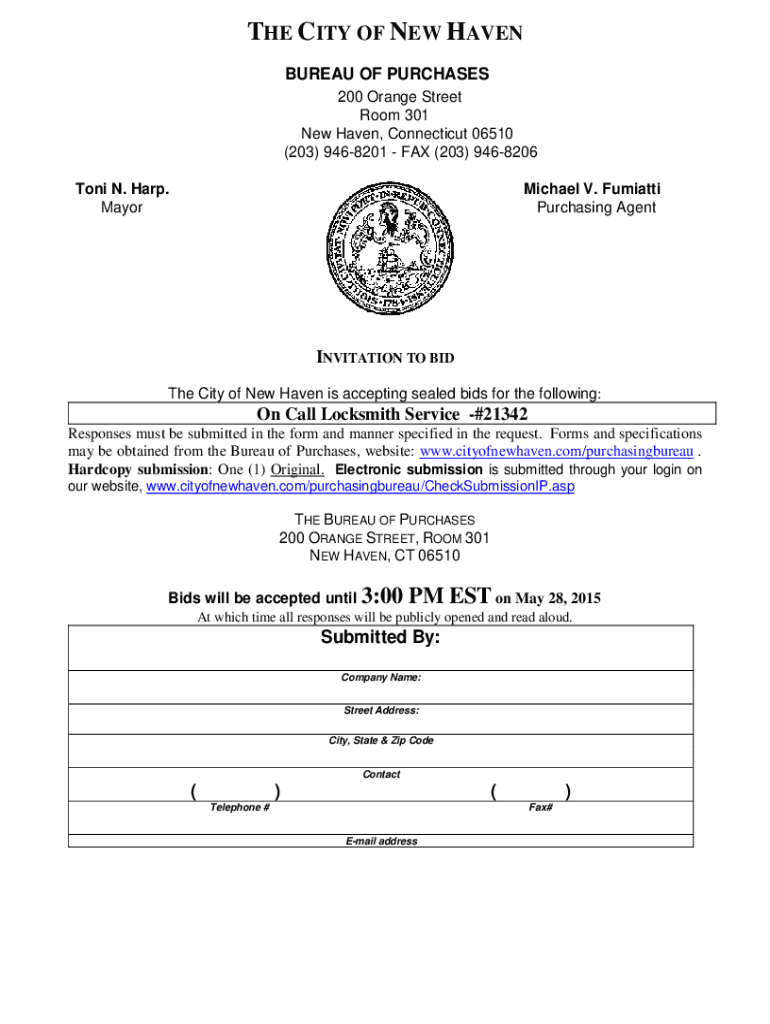 THE CITY OF NEW HAVEN BUREAU OF PURCHASES 200 Orange Street Room 301 New Haven, Connecticut 06510 (203) 9468201 FAX (203) 9468206 Toni N. Harp. Mayor Michael V. Bugatti Purchasing AgentINVITATION