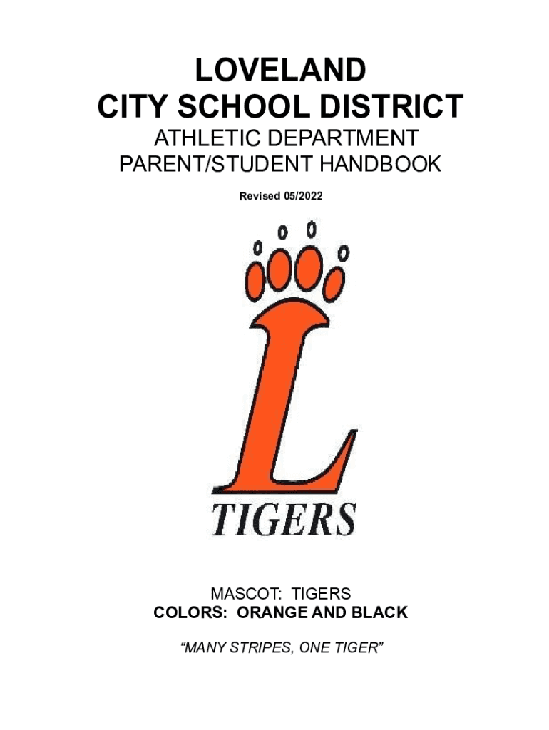 LOVELAND CITY SCHOOL DISTRICT ATHLETIC DEPARTMENT PARENT/STUDENT HANDBOOK Revised 05/2022MASCOT: TIGERS COLORS: ORANGE AND BLACK MANY STRIPES, ONE Timetable of Contents Athletic and ExtraCurricular