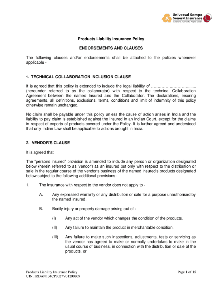 Products Liability Insurance Policy ENDORSEMENTS AND CLAUSES The following clauses and/or endorsements shall be attached to the policies whenever applicable 1. TECHNICAL COLLABORATION INCLUSION CLAUSE