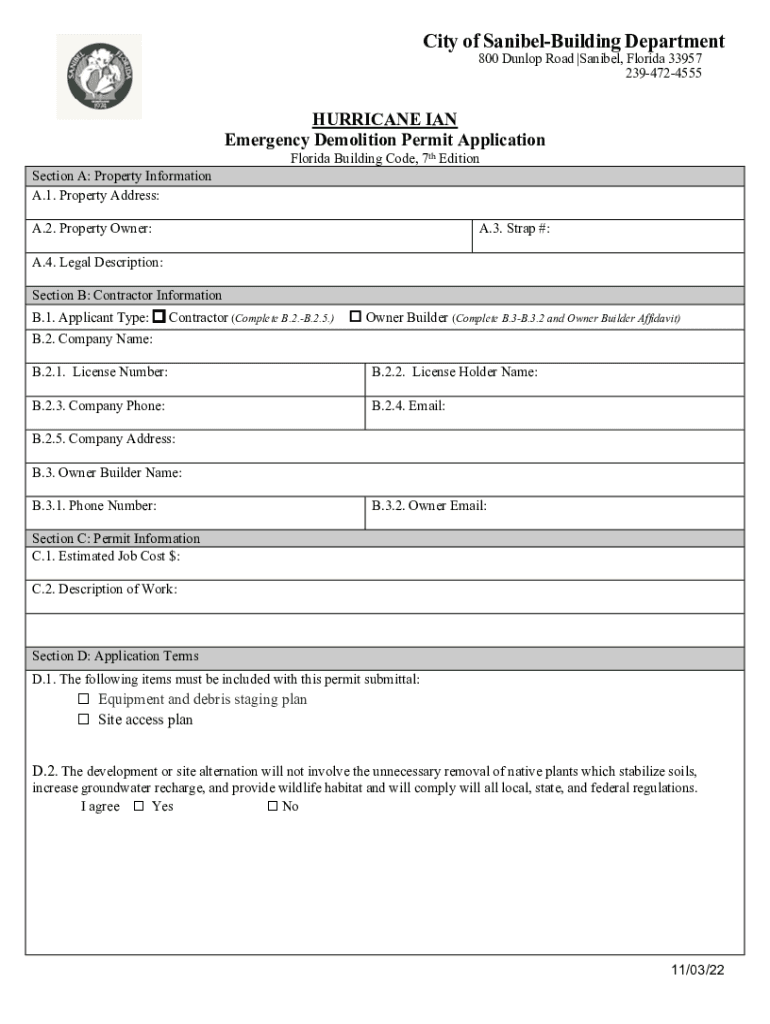 City of SanibelBuilding Department 800 Dunlop Road |Daniel, Florida 33957 2394724555HURRICANE IAN Emergency Demolition Permit Application Florida Building Code, 7th Edition Section A: Property Information