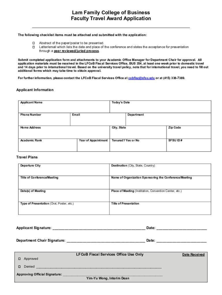 Lam Family College of Business Faculty Travel Award Application The following checklist items must be attached and submitted with the application: Abstract of the paper/poster to be presented. Letter/email
