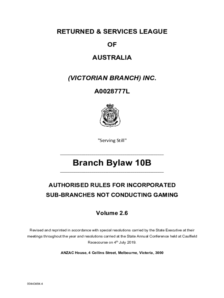RETURNED & SERVICES LEAGUE OF AUSTRALIA (VICTORIAN BRANCH) INC. A0028777L\” Serving Still\” ___Branch Bylaw 10B___Authorized RULES FOR INCORPORATED SUBBRANCHES NOT CONDUCTING GAMING Volume 2.6