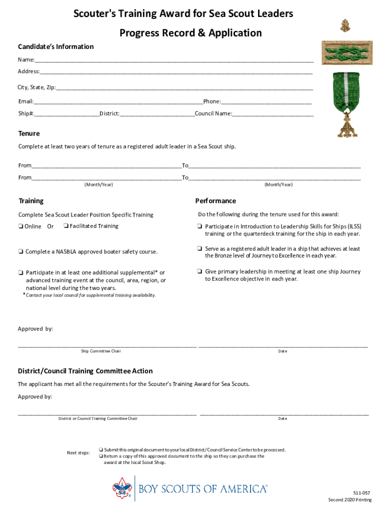 Scouter\'s Training Award for Sea Scout Leaders Progress Record & Application Candidates Information Name:___ Address:___ City, State, Zip:___ Email:___Phone:___ Ship#:___District:___Council Name:___Tenure