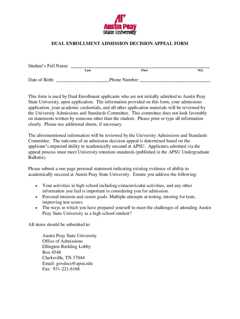 DUAL ENROLLMENT ADMISSION DECISION APPEAL FORMStudents Full Name: ___ LastFirstM. I. Date of Birth: ___Phone Number: ___This form is used by Dual Enrollment applicants who are not initially admitted