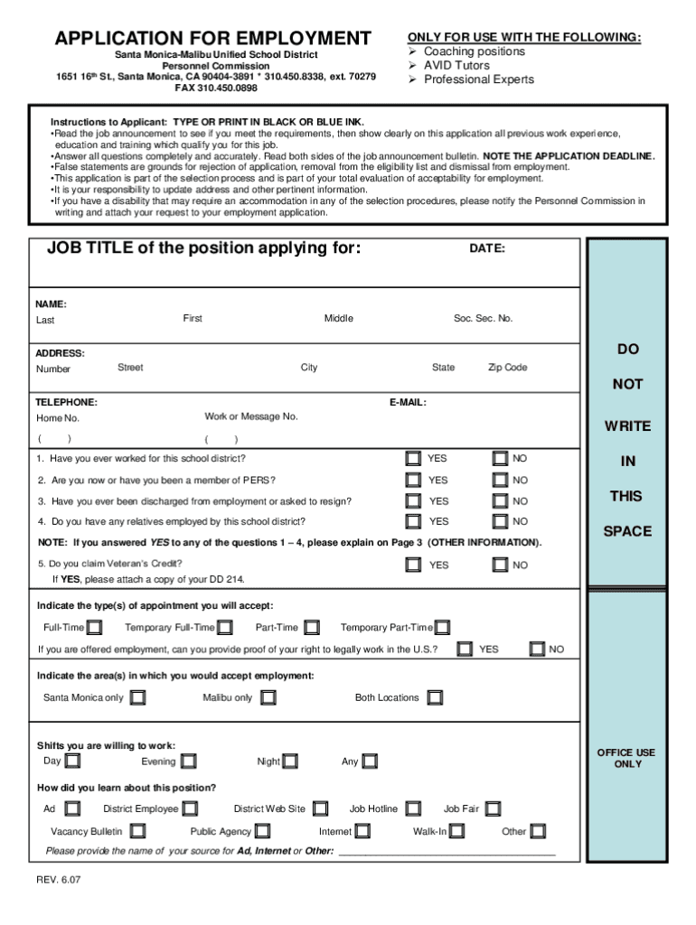 APPLICATION FOR EMPLOYMENTONLY FOR USE WITH THE FOLLOWING: Coaching positions AVID Tutors Professional Experts Santa Monica Malibu Unified School District Personnel Commission 1651 16th St., Santa