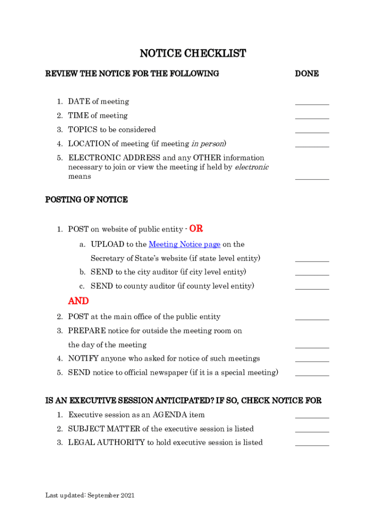NOTICE CHECKLIST REVIEW THE NOTICE FOR THE FOLLOWINGDONE1. DATE of meeting___2. TIME of meeting___3. TOPICS to be considered___4. LOCATION of meeting (if meeting in person)___5. ELECTRONIC ADDRESS