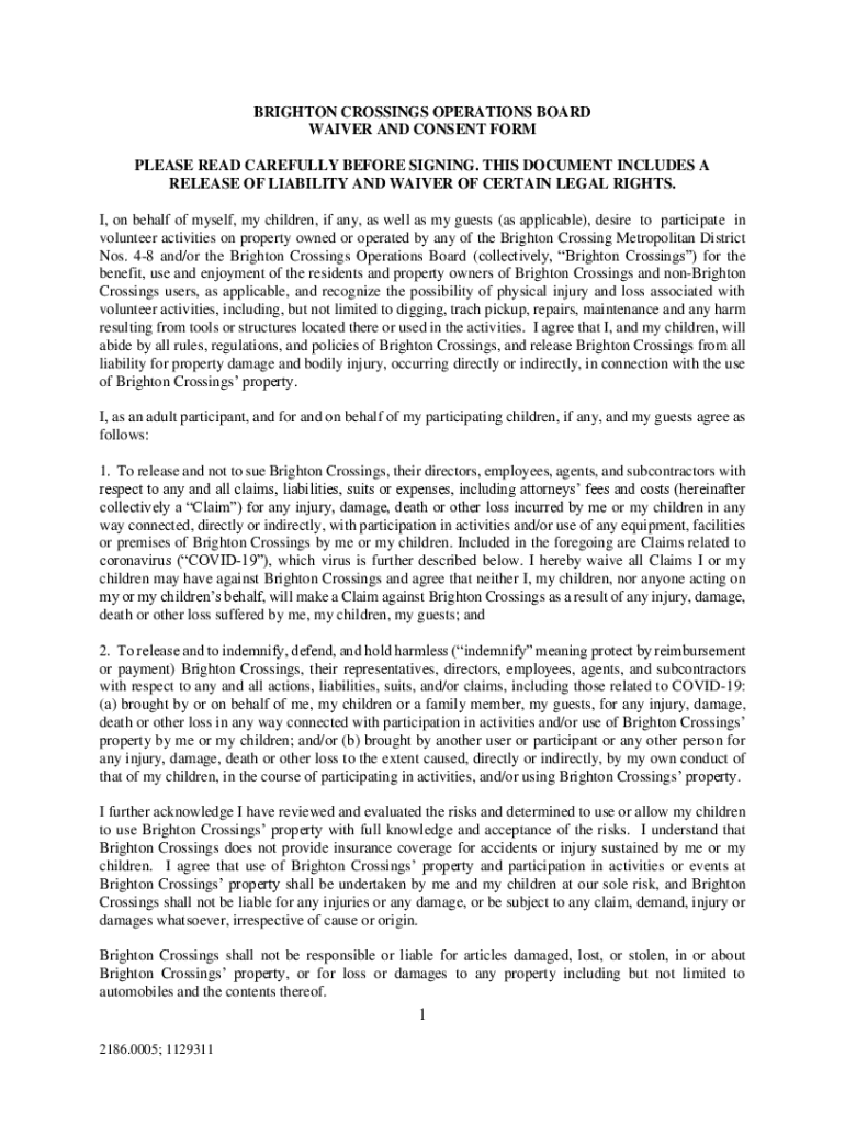 BRIGHTON CROSSINGS OPERATIONS BOARD WAIVER AND CONSENT FORM PLEASE READ CAREFULLY BEFORE SIGNING. THIS DOCUMENT INCLUDES A RELEASE OF LIABILITY AND WAIVER OF CERTAIN LEGAL RIGHTS. I, on behalf of