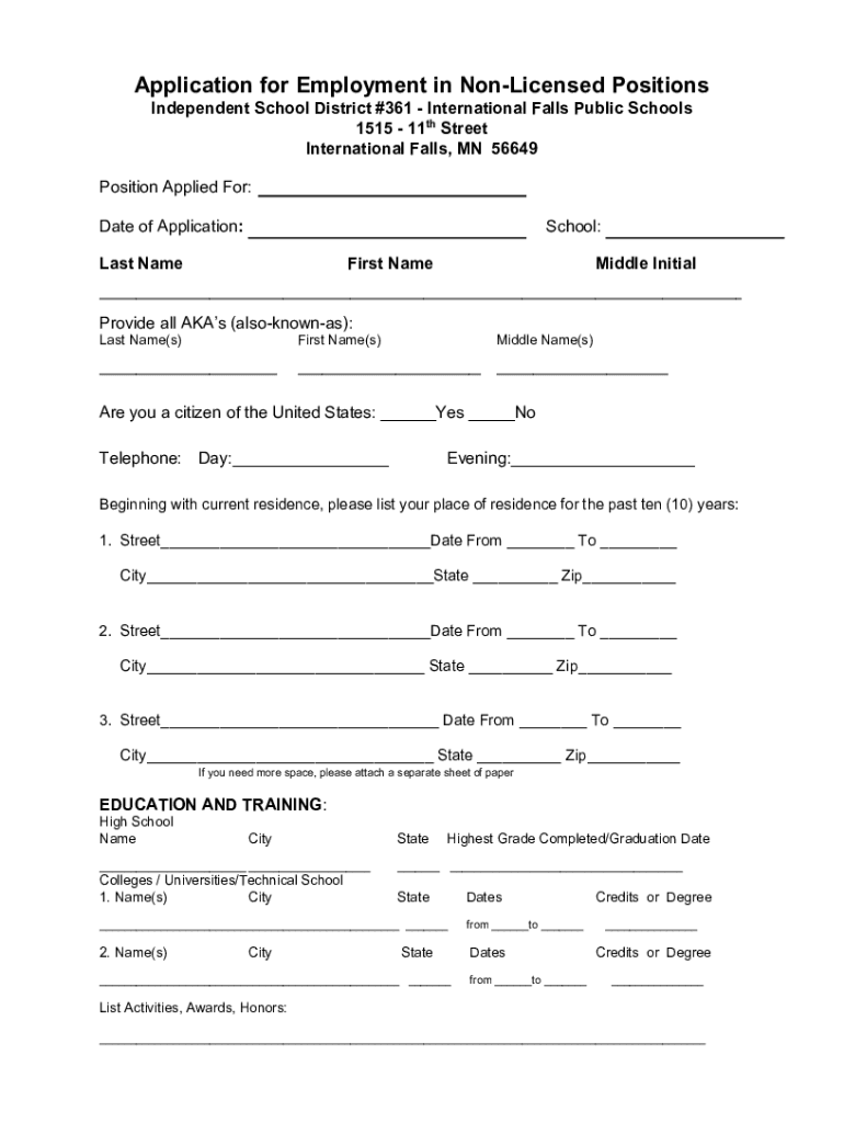 Application for Employment in Unlicensed Positions Independent School District #361 International Falls Public Schools 1515 11th Street International Falls, MN 56649 Position Applied For: Date of