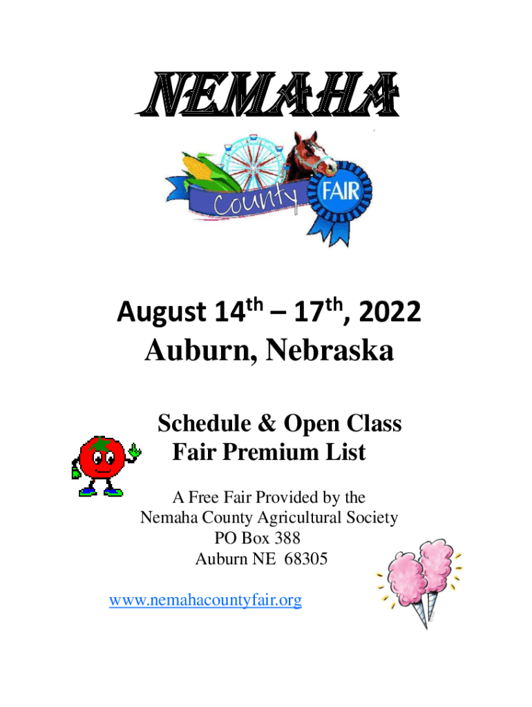 Nevada August 14th 17th, 2022 Auburn, Nebraska Schedule & Open Class Fair Premium List A Free Fair Provided by the Nevada County Agricultural Society PO Box 388 Auburn NE 68305 www.nemahacountyfair.orgNCAS