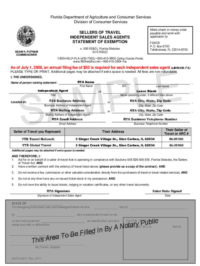 Florida Department of Agriculture and Consumer Services Division of Consumer Services Make check or money order payable and remit with application to:SELLERS OF TRAVEL INDEPENDENT SALES AGENTS STATEMENT