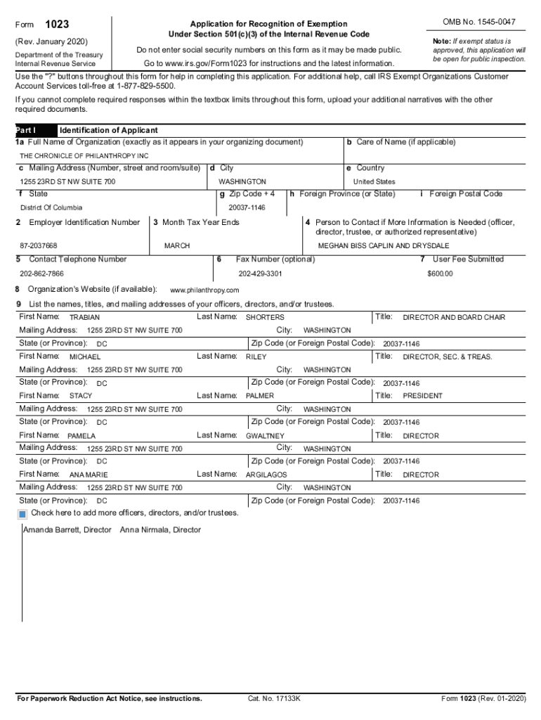 Form1023OMB No. 15450047Application for Recognition of Exemption Under Section 501(c)(3) of the Internal Revenue Code(Rev. January 2020)Note: If exempt status is approved, this application will be