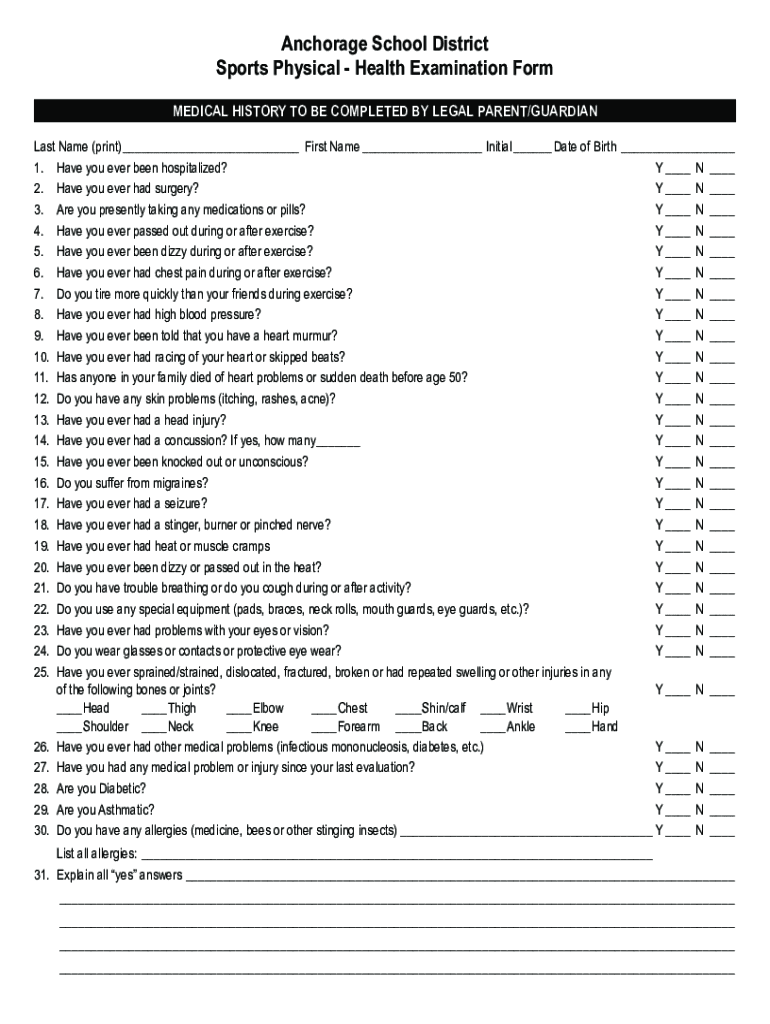 Anchorage School District Sports Physical Health Examination Form MEDICAL HISTORY TO BE COMPLETED BY LEGAL PARENT/GUARDIAN Last Name (print)___ First Name___ Initial___ Date of Birth___ 1. Have you