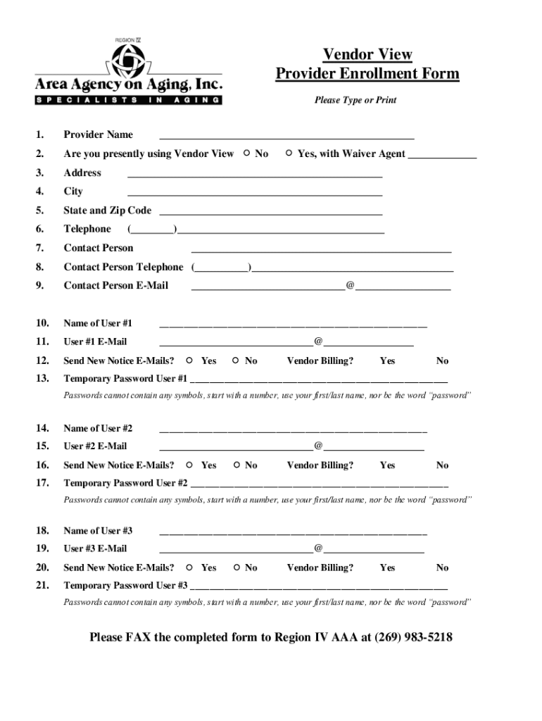 Please Type or Print1. Provider Name___2. Are you presently using Vendor View3? Address___4. City___5. State and Zip Code ___6. Telephone7. Contact Person8. Contact