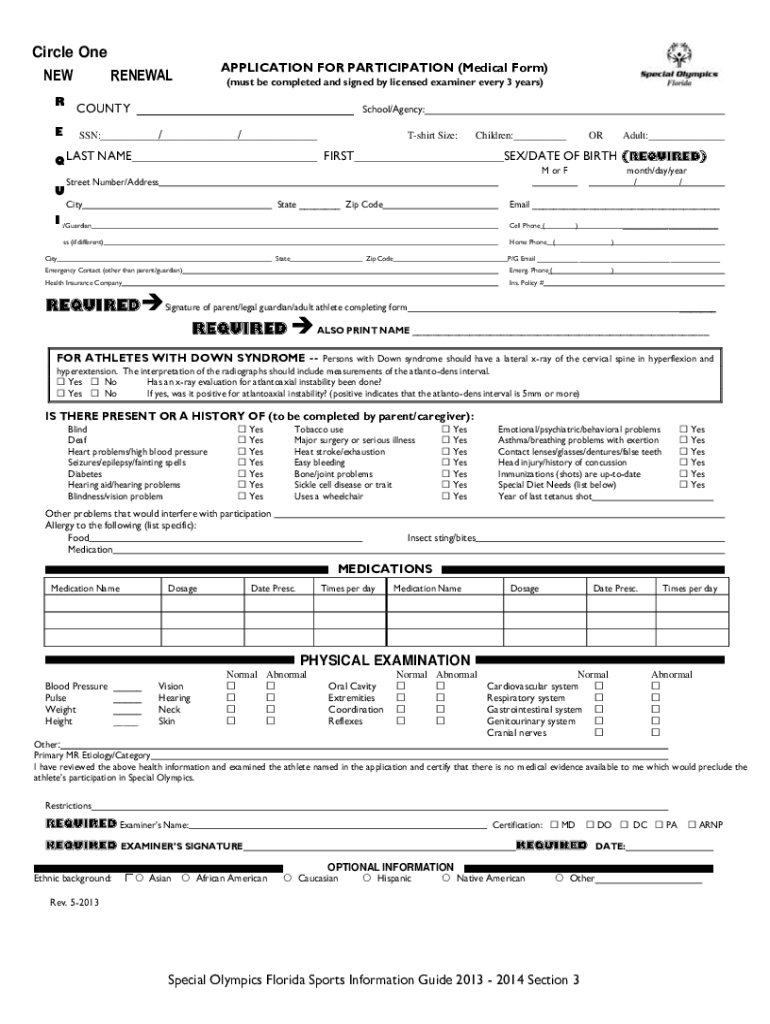 Circle One NEW RENEWAL R ECOUNTYAPPLICATION FOR PARTICIPATION (Medical Form) (must be completed and signed by licensed examiner every 3 years)___ /SSN:/Shirt Size:Q LAST NAME School/Agency: Children:Adult:SEX/DATE