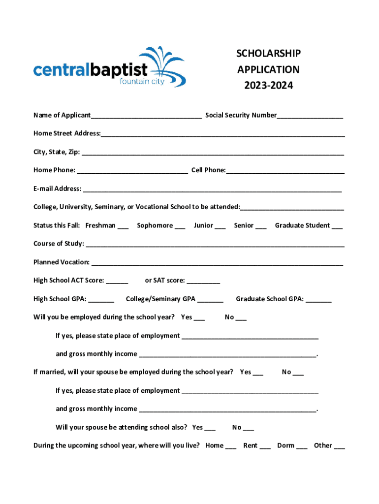 SCHOLARSHIP APPLICATION 20232024 Name of Applicant___ Social Security Number___ Home Street Address:___ City, State, Zip: ___ Home Phone: ___ Cell Phone:___ Email Address: ___ College, University,