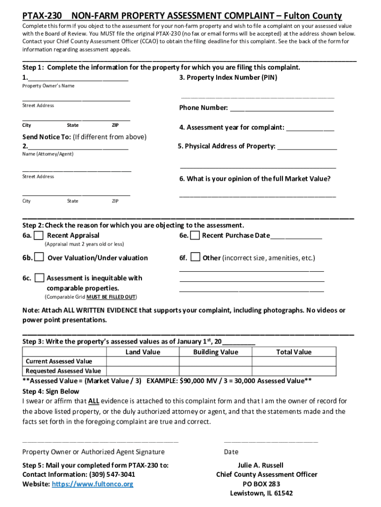 PTAX230 NONFARM PROPERTY ASSESSMENT COMPLAINT Fulton County Complete this form if you object to the assessment for your nonfarm property and wish to file a complaint on your assessed value with the