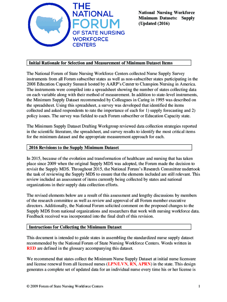 National Nursing Workforce Minimum Datasets: Supply (Updated (2016)Initial Rationale for Selection and Measurement of Minimum Dataset Items The National Forum of State Nursing Workforce Centers collected