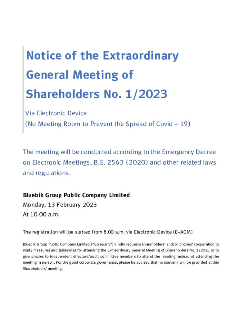 Notice of the Extraordinary General Meeting of Shareholders No. 1/2023 Via Electronic Device (No Meeting Room to Prevent the Spread of COVID-19) The meeting will be conducted according to the Emergency