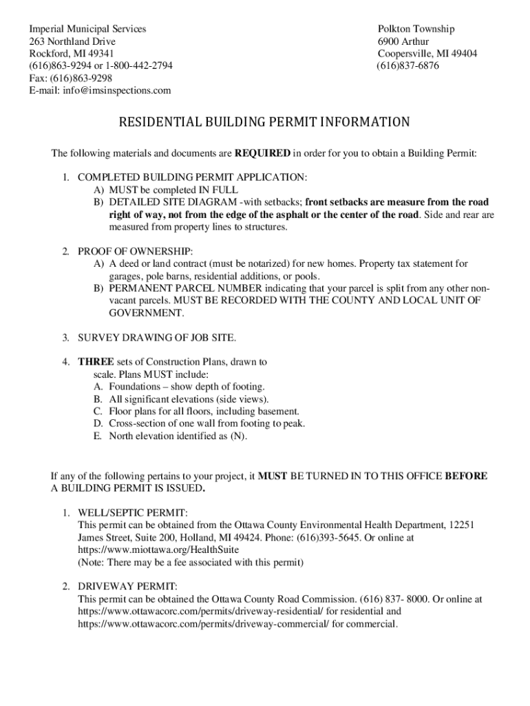 Imperial Municipal Services 263 Northland Drive Rockford, MI 49341 (616)8639294 or 18004422794 Fax: (616)8639298 Email: info@imsinspections.comPolkton Township 6900 Arthur Cartersville, MI 49404 (616)8376876RESIDENTIAL