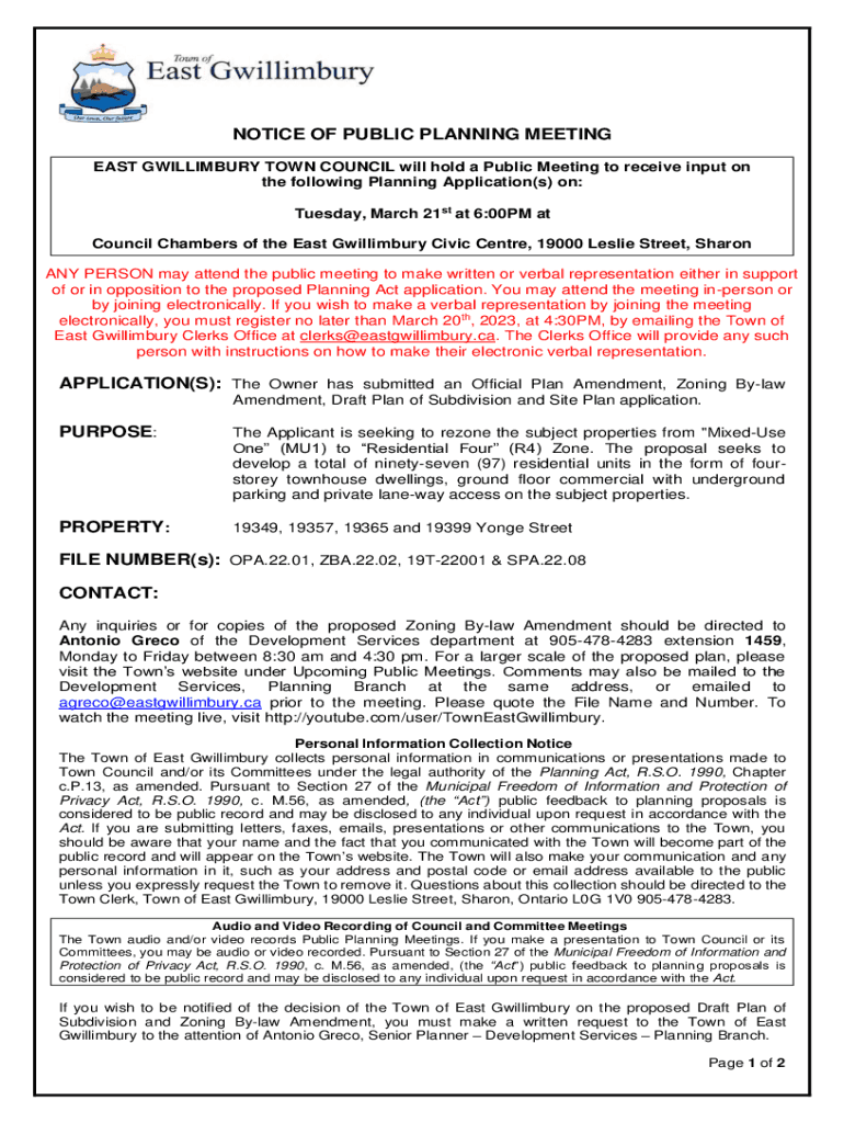 NOTICE OF PUBLIC PLANNING MEETING EAST GWILLIMBURY TOWN COUNCIL will hold a Public Meeting to receive input on the following Planning Application(s) on: Tuesday, March 21st at 6:00PM at Council Chambers