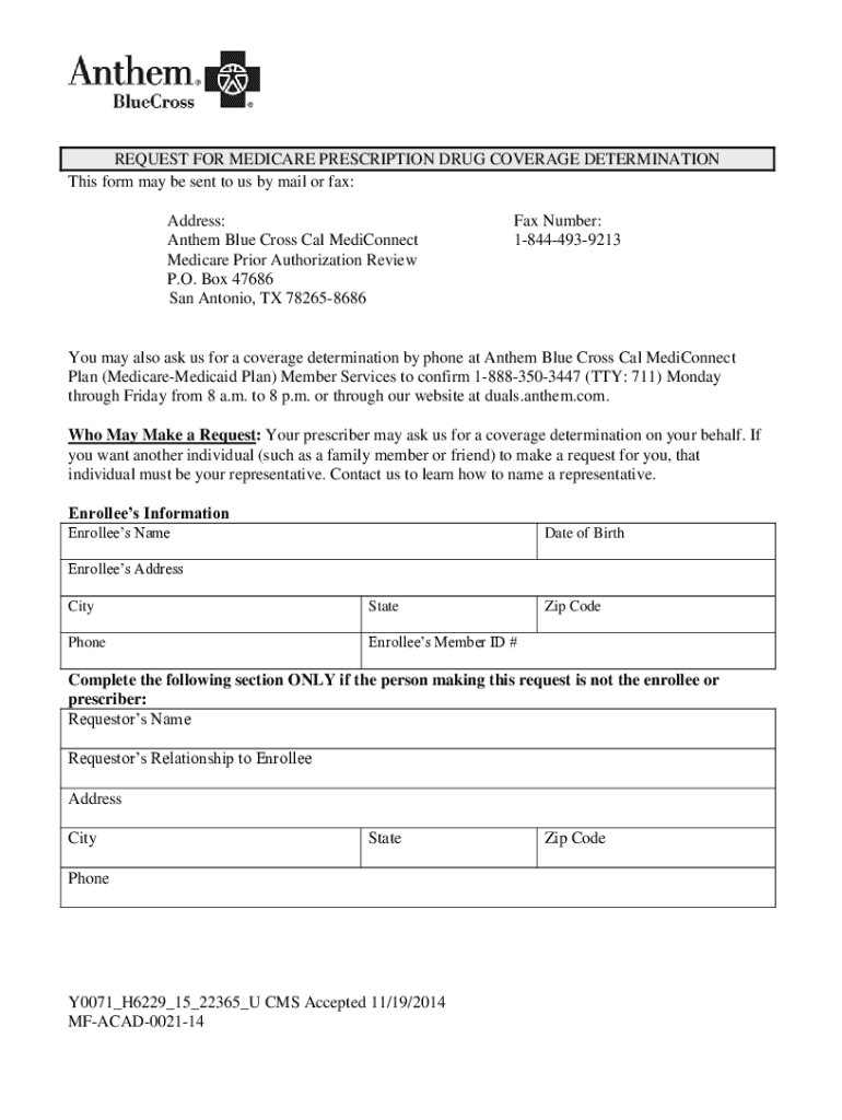 REQUEST FOR MEDICARE PRESCRIPTION DRUG COVERAGE DETERMINATION This form may be sent to us by mail or fax: Address: Anthem Blue Cross Cal Disconnect Medicare Prior Authorization Review P.O. Box 47686