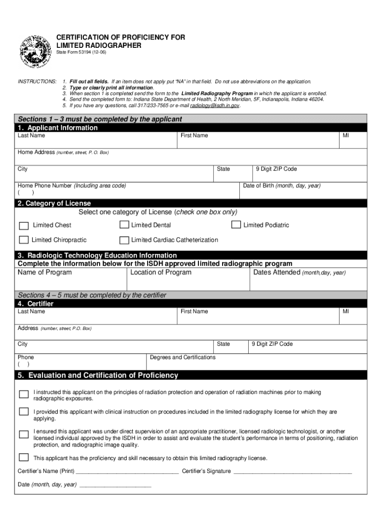 CERTIFICATION OF PROFICIENCY FOR LIMITED RADIOGRAPHER State Form 53194 (1206)INSTRUCTIONS:1. 2. 3. 4. 5. Fill out all fields. If an item does not apply put NA in that field. Do not use abbreviations