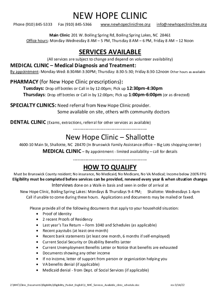 NEW HOPE CLINIC Phone (910) 8455333Fax (910) 8455366www.newhopeclinicfree.orginfo@newhopeclinicfree.orgMain Clinic: 201 W. Boiling Spring Rd, Boiling Spring Lakes, NC 28461 Office hours: Monday Wednesday