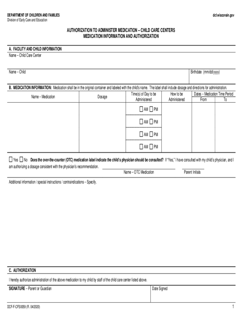 Division of Early Care and Education. Wisconsin.authorization TO ADMINISTER MEDICATION CHILD CARE CENTERS