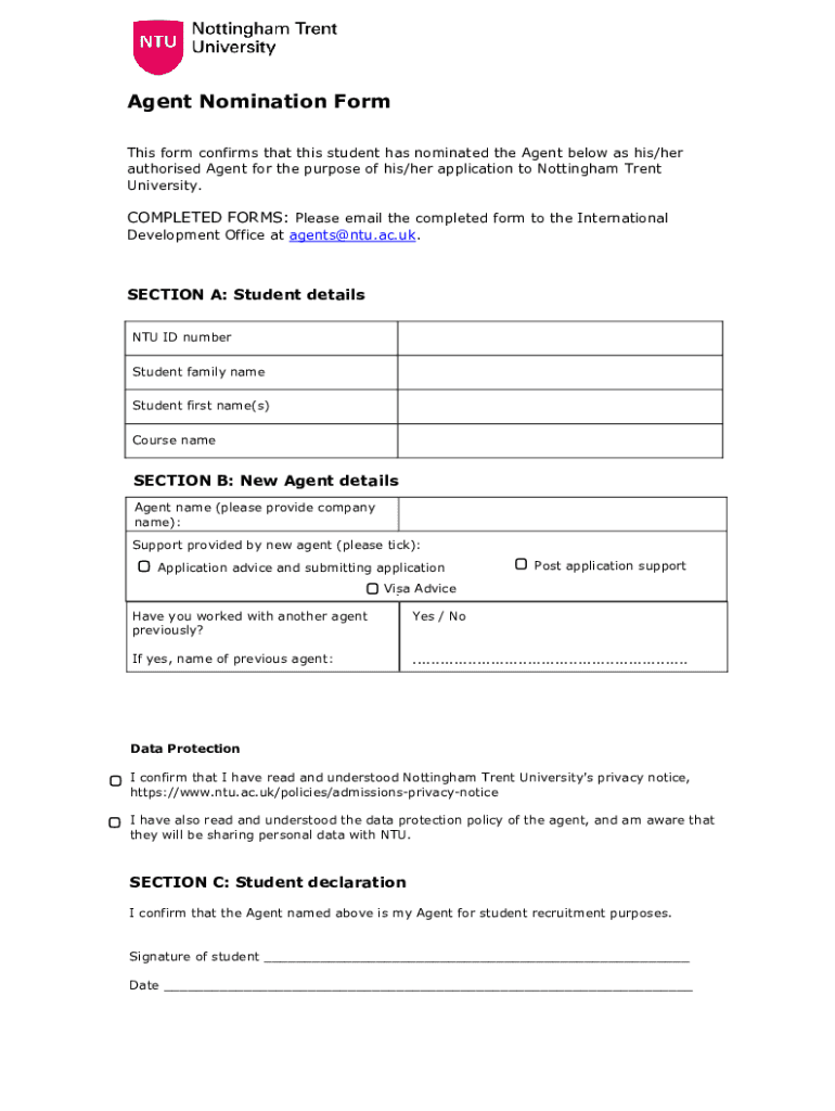 Agent Nomination Form This form confirms that this student has nominated the Agent below as his/her authorized Agent for the purpose of his/her application to Nottingham Trent University. COMPLETED