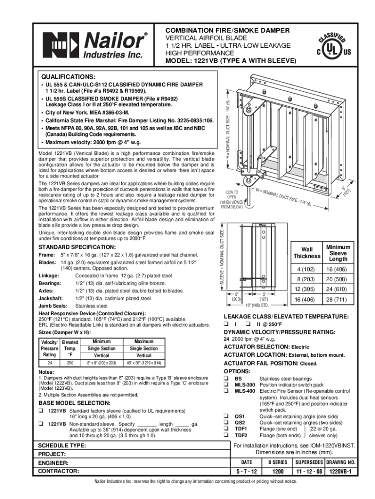 COMBINATION FIRE /SMOKE DAMPER VERTICAL AIRFOIL BLADE 1 1/2 HR. LABEL ULTRA LEAKAGE HIGH PERFORMANCE MODEL: 1221VB (TYPE A WITH SLEEVE) QUALIFICATIONS:STANDARD SPECIFICATION: Frame: 5\” x 7/8\”