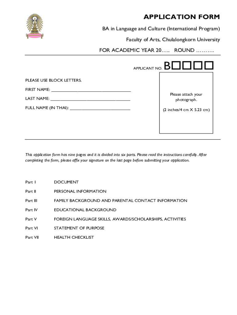APPLICATION FORM BA in Language and Culture (International Program) Faculty of Arts, Chulalongkorn University FOR ACADEMIC YEAR 20. ROUND. APPLICANT NO.PLEASE USE BLOCK LETTERS. FIRST NAME: ___ LAST