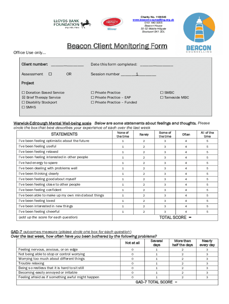 Charity No. 1109545 www.beaconcounselling.org.uk 0161 440 0055 Beacon House 5052 Middle Hill gate Stockport SK1 3DLBeacon Client Monitoring Form Office Use only Client number: ___ ___ AssessmentORDate