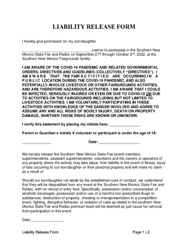 LIABILITY RELEASE FORM I hereby give permission for my son/daughter ___(name) to participate in the Southern New Mexico State Fair and Rodeo on September 27th through October 2nd, 2022, at the Southern